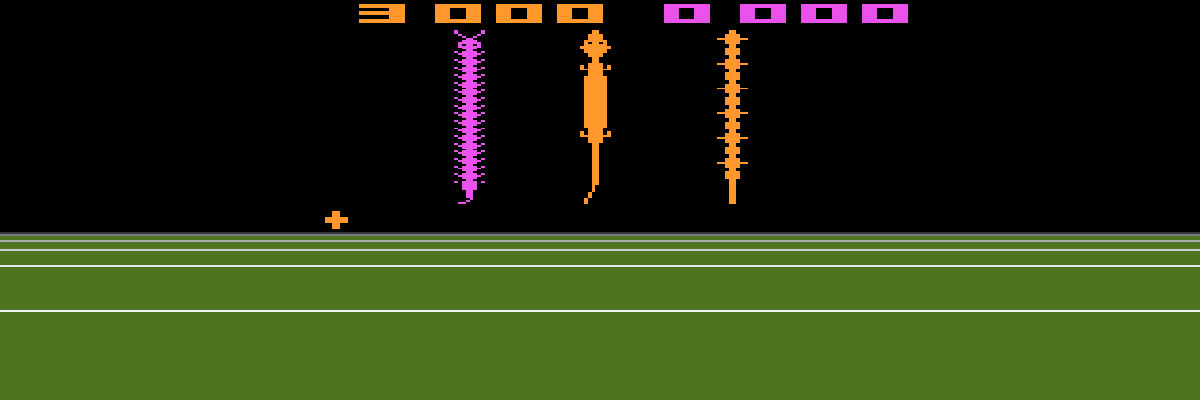 Using your paddle controller, position your Ultrasonic Weapon (the "aiming cursor" seen on your screen) directly below the emerging Bugs. You will see Ultrasonic Energy Packets leaving your ship's firing bays and moving toward the aiming cursor to destroy the Bug above. You must destroy the Bugs before they completely leave their nests or they will damage your ship.